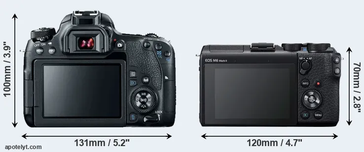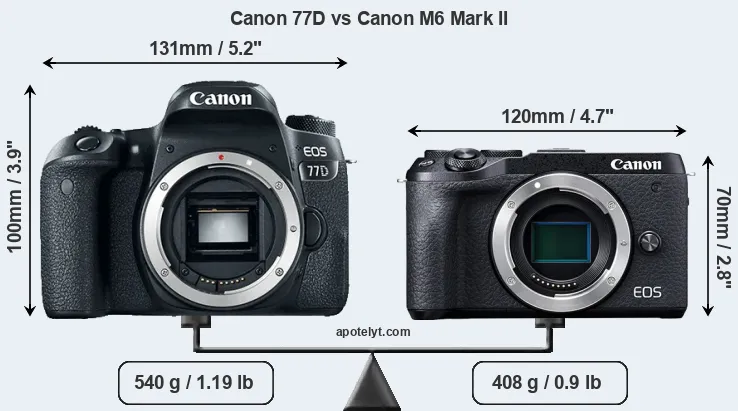 La taille physique et le poids du Canon 77D et du Canon M6 Mark II sont illustrés dans le graphique ci-dessous. Les deux caméras sont affichées en fonction de leur taille relative. Toutes les dimensions sont arrondies au millimètre près.