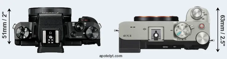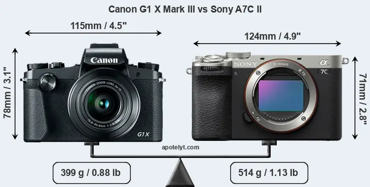 La taille physique et le poids du Canon G1 X Mark III et du Sony A7C II sont illustrés dans le graphique ci-dessous. Les deux caméras sont affichées en fonction de leur taille relative. Toutes les dimensions sont arrondies au millimètre près.