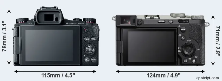 Le Canon PowerShot G1 X Mark III et le Sony Alpha A7C II sont deux appareils photo numériques, qui ont été révélés au public, respectivement, en October 2017 et August 2023. Le G1X Mark III est un appareil photo compact à objectif intégré, tandis que le A7C II est un appareil photo à objectif interchangeable sans miroir. Les caméras sont équipés d'un capteur APS-C (G1X Mark III) et un capteur plein format (A7C II). Le Canon a une résolution de 24,0 mégapixels, alors que le Sony fournit 32,7 MP.