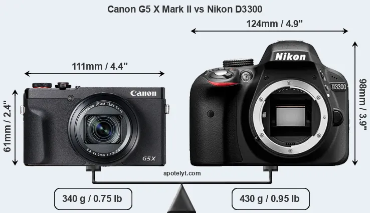 La taille physique et le poids du Canon G5 X Mark II et du Nikon D3300 sont illustrés dans le graphique ci-dessous. Les deux caméras sont affichées en fonction de leur taille relative. Toutes les dimensions sont arrondies au millimètre près.