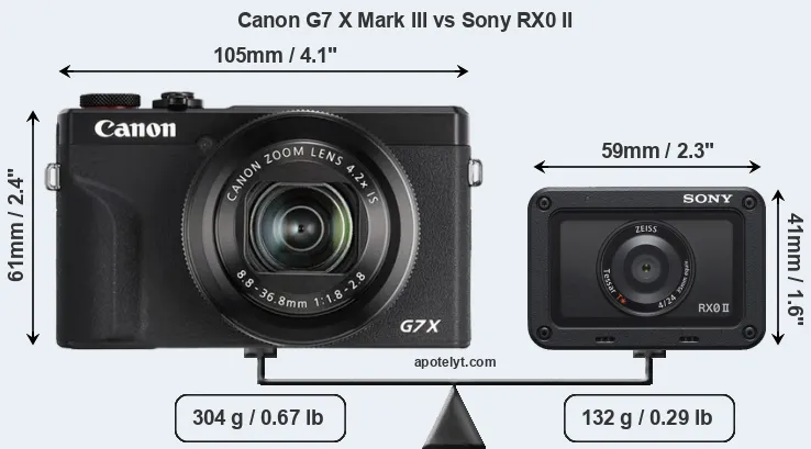 La taille physique et le poids du Canon G7 X Mark III et du Sony RX0 II sont illustrés dans le graphique ci-dessous. Les deux caméras sont affichées en fonction de leur taille relative. Toutes les dimensions sont arrondies au millimètre près.