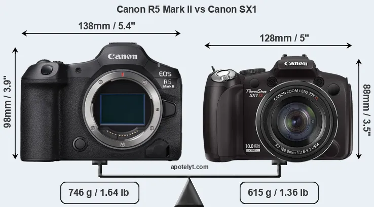 La taille physique et le poids du Canon R5 Mark II et du Canon SX1 sont illustrés dans le graphique ci-dessous. Les deux caméras sont affichées en fonction de leur taille relative. Toutes les dimensions sont arrondies au millimètre près.