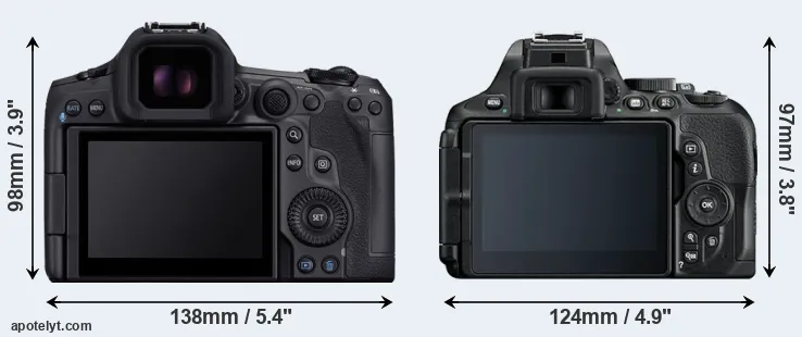 La taille physique et le poids du Canon R5 Mark II et du Nikon D5600 sont illustrés dans le graphique ci-dessous. Les deux caméras sont affichées en fonction de leur taille relative. Toutes les dimensions sont arrondies au millimètre près.