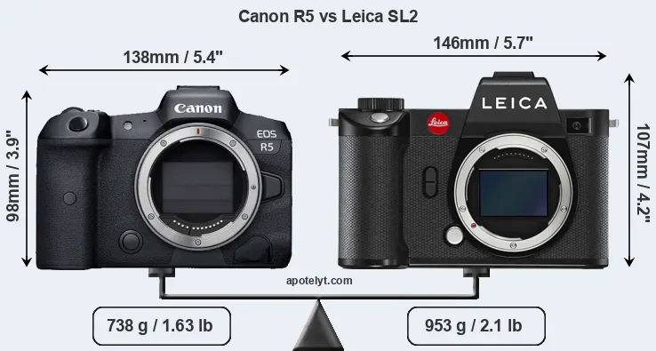 La taille physique et le poids du Canon R5 et du Leica SL2 sont illustrés dans le graphique ci-dessous. Les deux caméras sont affichées en fonction de leur taille relative. Toutes les dimensions sont arrondies au millimètre près.
