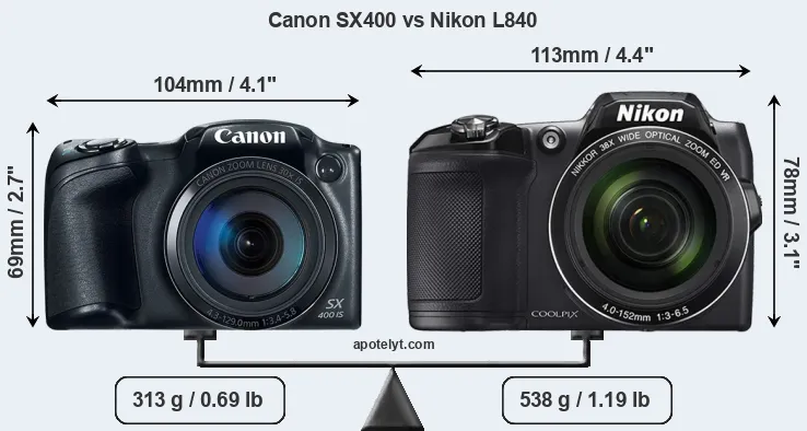 La taille physique et le poids du Canon SX400 et du Nikon L840 sont illustrés dans le graphique ci-dessous. Les deux caméras sont affichées en fonction de leur taille relative. Toutes les dimensions sont arrondies au millimètre près.