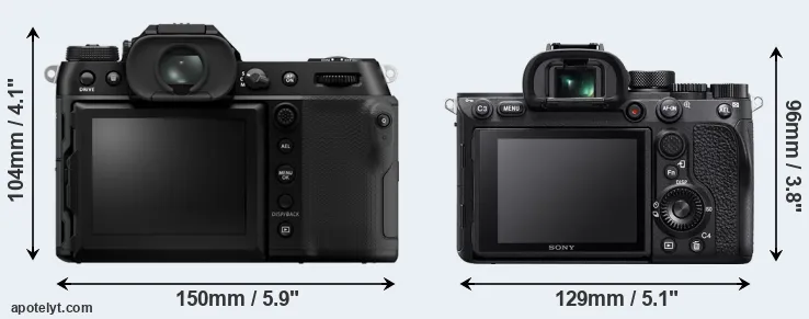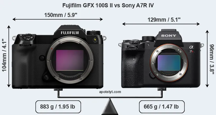 La taille physique et le poids du Fujifilm GFX 100S II et du Sony A7R IV sont illustrés dans le graphique ci-dessous. Les deux caméras sont affichées en fonction de leur taille relative. Toutes les dimensions sont arrondies au millimètre près.