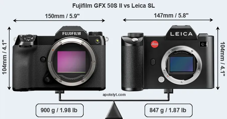 La taille physique et le poids du Fujifilm GFX 50S II et du Leica SL sont illustrés dans le graphique ci-dessous. Les deux caméras sont affichées en fonction de leur taille relative. Toutes les dimensions sont arrondies au millimètre près.