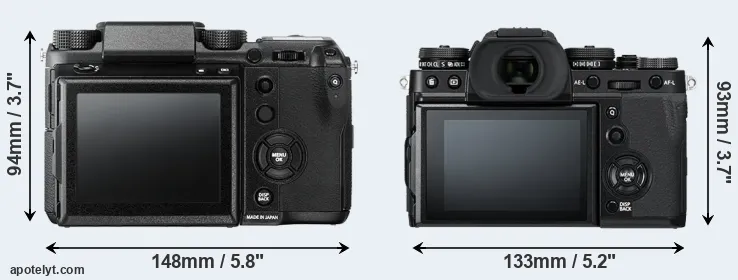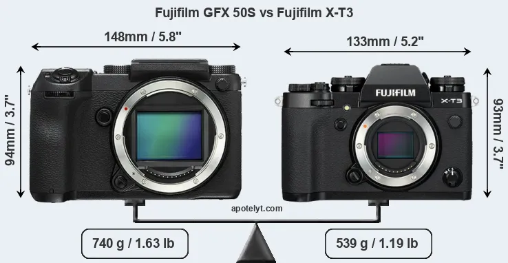 Le Fujifilm GFX 50S et le Fujifilm X-T3 sont deux appareils photo numériques, qui ont été révélés au public, respectivement, en September 2016 et September 2018. Les deux sont des appareil photo à objectif interchangeable sans miroir, qui sont équipés d'un capteur moyen format (GFX 50S) et un capteur APS-C (X-T3). Le GFX 50S a une résolution de 51,1 mégapixels, alors que le X-T3 fournit 26,0 MP.