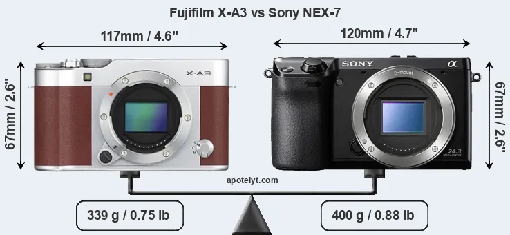 La taille physique et le poids du Fujifilm X-A3 et du Sony NEX-7 sont illustrés dans le graphique ci-dessous. Les deux caméras sont affichées en fonction de leur taille relative. Toutes les dimensions sont arrondies au millimètre près.
