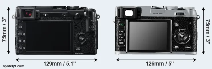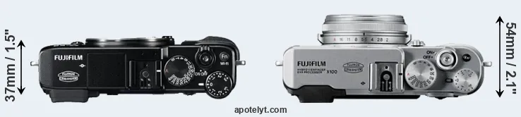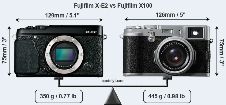 La taille physique et le poids du Fujifilm X-E2 et du Fujifilm X100 sont illustrés dans le graphique ci-dessous. Les deux caméras sont affichées en fonction de leur taille relative. Toutes les dimensions sont arrondies au millimètre près.
