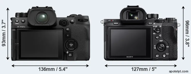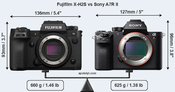 Le Fujifilm X-H2S et le Sony Alpha A7R II sont deux appareils photo numériques, qui ont été révélés au public, respectivement, en May 2022 et June 2015. Les deux sont des appareil photo à objectif interchangeable sans miroir, qui sont équipés d'un capteur APS-C (X-H2S) et un capteur plein format (A7R II). Le Fujifilm a une résolution de 26,0 mégapixels, alors que le Sony fournit 42,2 MP.