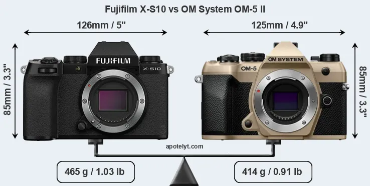Le Fujifilm X-S10 et le OM System OM-5 II sont deux appareils photo numériques, qui ont été révélés au public, respectivement, en October 2020 et June 2025. Les deux sont des appareil photo à objectif interchangeable sans miroir, qui sont équipés d'un capteur APS-C (X-S10) et un capteur quatre tiers (OM-5 II). Le Fujifilm a une résolution de 26,0 mégapixels, alors que le OM System fournit 20,2 MP.