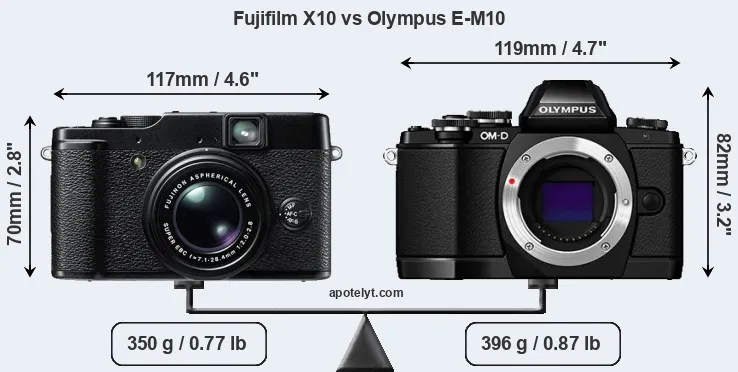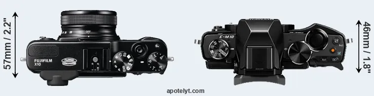 La taille physique et le poids du Fujifilm X10 et du Olympus E-M10 sont illustrés dans le graphique ci-dessous. Les deux caméras sont affichées en fonction de leur taille relative. Toutes les dimensions sont arrondies au millimètre près.
