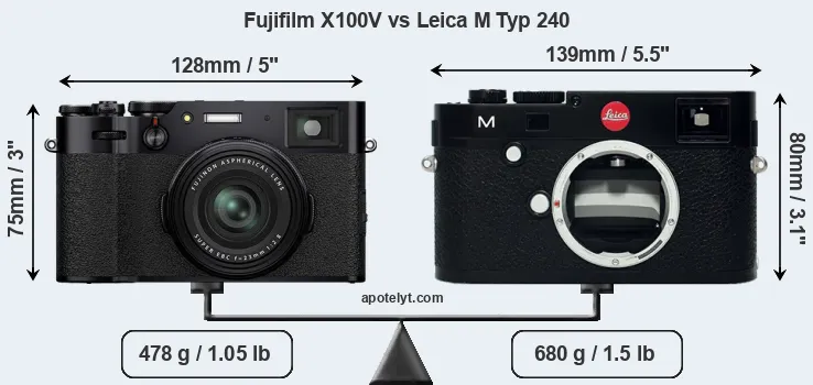 Le Fujifilm X100V et le Leica M (Typ 240) sont deux appareils photo numériques, qui ont été révélés au public, respectivement, en February 2020 et September 2012. Le X100V est un appareil photo compact à objectif intégré, tandis que le M Typ 240 est un appareil photo sans miroir à mise au point par télémètre. Les caméras sont équipés d'un capteur APS-C (X100V) et un capteur plein format (M Typ 240). Le Fujifilm a une résolution de 26,0 mégapixels, alors que le Leica fournit 23,7 MP.