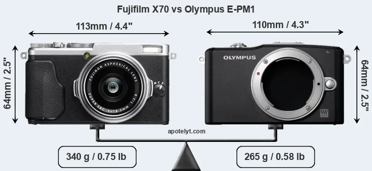 La taille physique et le poids du Fujifilm X70 et du Olympus E-PM1 sont illustrés dans le graphique ci-dessous. Les deux caméras sont affichées en fonction de leur taille relative. Toutes les dimensions sont arrondies au millimètre près.
