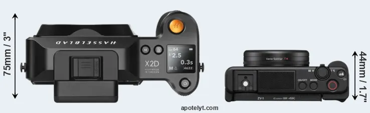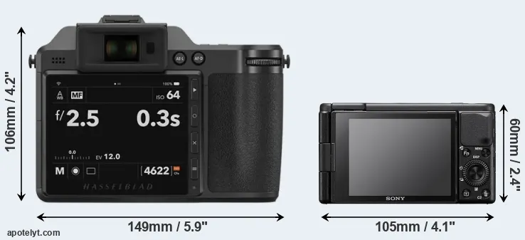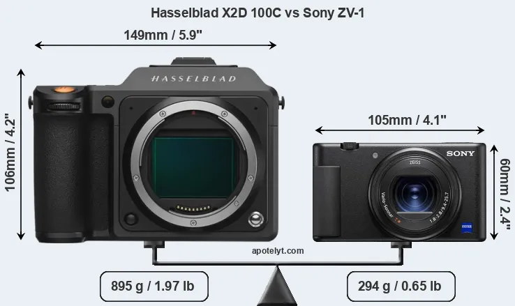 La taille physique et le poids du Hasselblad X2D 100C et du Sony ZV-1 sont illustrés dans le graphique ci-dessous. Les deux caméras sont affichées en fonction de leur taille relative. Toutes les dimensions sont arrondies au millimètre près.
