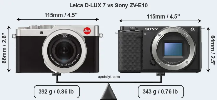 Le Leica D-LUX 7 et le Sony ZV-E10 sont deux appareils photo numériques, qui ont été révélés au public, respectivement, en November 2018 et July 2021. Le D-LUX 7 est un appareil photo compact à objectif intégré, tandis que le ZV-E10 est un appareil photo à objectif interchangeable sans miroir. Les caméras sont équipés d'un capteur quatre tiers (D-LUX 7) et un capteur APS-C (ZV-E10). Le Leica a une résolution de 16,8 mégapixels, alors que le Sony fournit 24,0 MP.