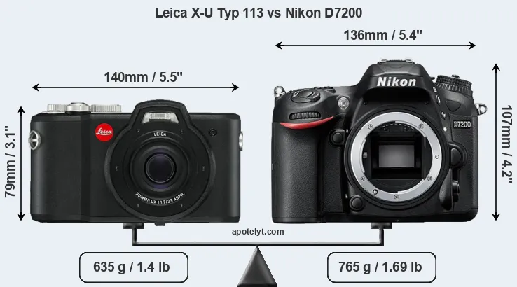 La taille physique et le poids du Leica X-U Typ 113 et du Nikon D7200 sont illustrés dans le graphique ci-dessous. Les deux caméras sont affichées en fonction de leur taille relative. Toutes les dimensions sont arrondies au millimètre près.