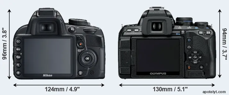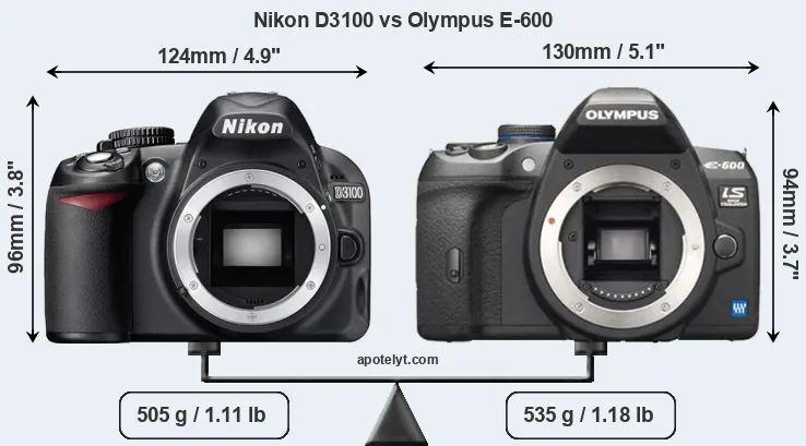 La taille physique et le poids du Nikon D3100 et du Olympus E-600 sont illustrés dans le graphique ci-dessous. Les deux caméras sont affichées en fonction de leur taille relative. Toutes les dimensions sont arrondies au millimètre près.