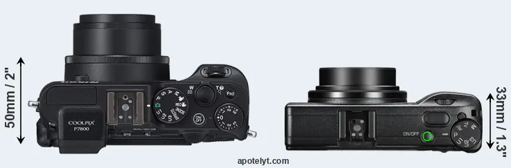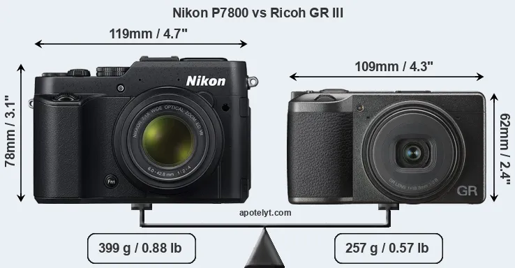 La taille physique et le poids du Nikon P7800 et du Ricoh GR III sont illustrés dans le graphique ci-dessous. Les deux caméras sont affichées en fonction de leur taille relative. Toutes les dimensions sont arrondies au millimètre près.
