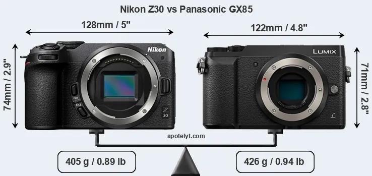 Le Nikon Z30 et le Panasonic Lumix DMC-GX85 sont deux appareils photo numériques, qui ont été révélés au public, respectivement, en June 2022 et April 2016. Les deux sont des appareil photo à objectif interchangeable sans miroir, qui sont équipés d'un capteur APS-C (Z30) et un capteur quatre tiers (GX85). Le Nikon a une résolution de 20,7 mégapixels, alors que le Panasonic fournit 15,8 MP.