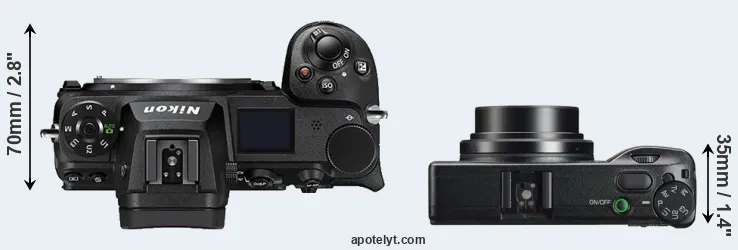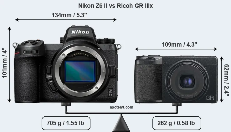 La taille physique et le poids du Nikon Z6 II et du Ricoh GR IIIx sont illustrés dans le graphique ci-dessous. Les deux caméras sont affichées en fonction de leur taille relative. Toutes les dimensions sont arrondies au millimètre près.