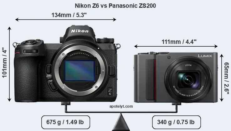 La taille physique et le poids du Nikon Z6 et du Panasonic ZS200 sont illustrés dans le graphique ci-dessous. Les deux caméras sont affichées en fonction de leur taille relative. Toutes les dimensions sont arrondies au millimètre près.