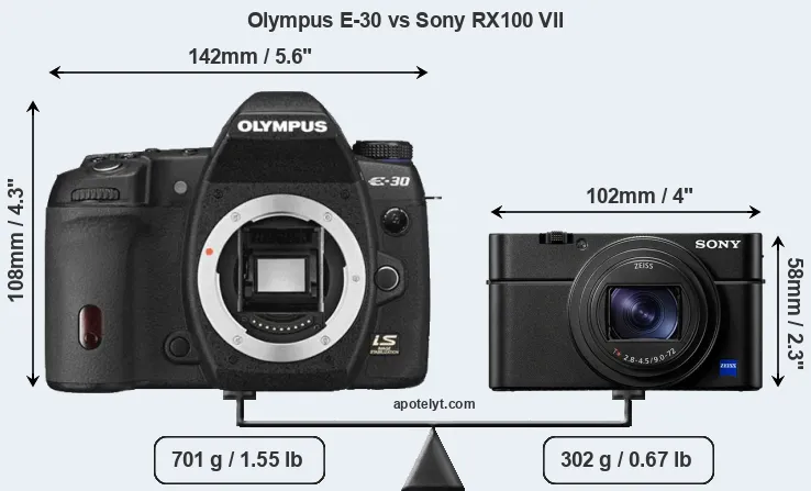 Au-delà de cet instantané des principales fonctionnalités et caractéristiques, quelles sont les différences entre le Olympus E-30 et le Sony Cyber-shot DSC-RX100 VII ? Lequel devriez-vous acheter ? Lisez la suite pour découvrir comment ces deux appareils photo se comparent en ce qui concerne leur taille et d'autres détails.