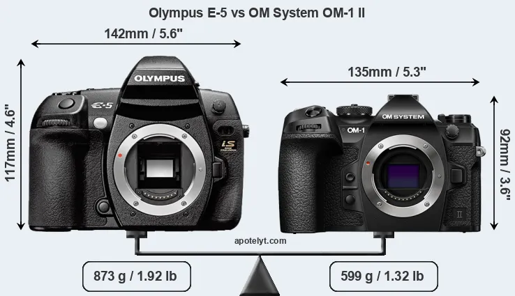 Le Olympus E-5 et le OM System OM-1 II sont deux appareils photo numériques, qui ont été révélés au public, respectivement, en September 2010 et January 2024. Le E-5 est un appareil photo reflex numérique, tandis que le OM-1 II est un appareil photo à objectif interchangeable sans miroir.Les deux caméras sont équipés d'un capteur quatre tiers. Le Olympus a une résolution de 12,2 mégapixels, alors que le OM System fournit 20,2 MP.