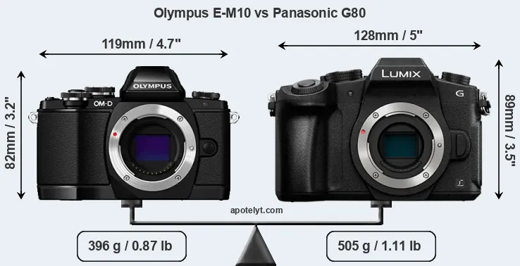 La taille physique et le poids du Olympus E-M10 et du Panasonic G80 sont illustrés dans le graphique ci-dessous. Les deux caméras sont affichées en fonction de leur taille relative. Toutes les dimensions sont arrondies au millimètre près.