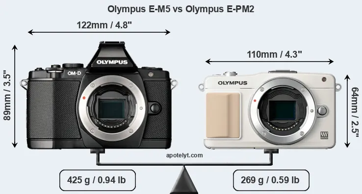 La taille physique et le poids du Olympus E-M5 et du Olympus E-PM2 sont illustrés dans le graphique ci-dessous. Les deux caméras sont affichées en fonction de leur taille relative. Toutes les dimensions sont arrondies au millimètre près.