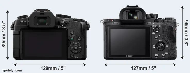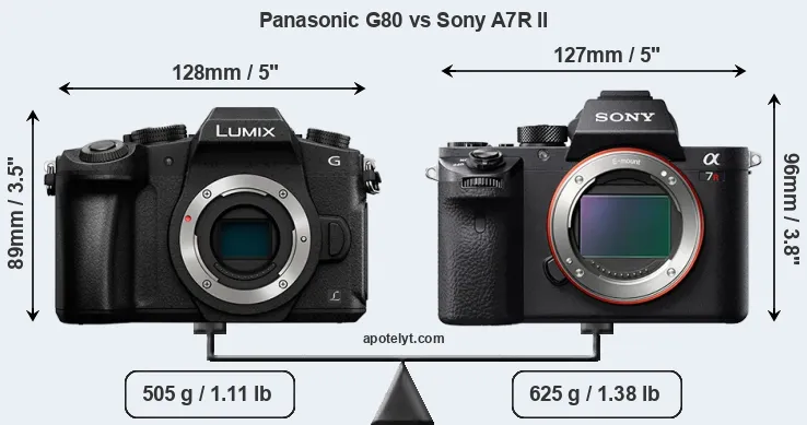 La taille physique et le poids du Panasonic G80 et du Sony A7R II sont illustrés dans le graphique ci-dessous. Les deux caméras sont affichées en fonction de leur taille relative. Toutes les dimensions sont arrondies au millimètre près.