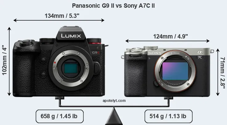 La taille physique et le poids du Panasonic G9 II et du Sony A7C II sont illustrés dans le graphique ci-dessous. Les deux caméras sont affichées en fonction de leur taille relative. Toutes les dimensions sont arrondies au millimètre près.
