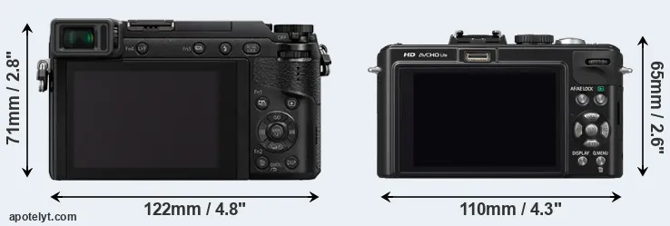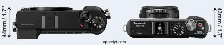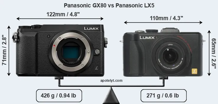 La taille physique et le poids du Panasonic GX80 et du Panasonic LX5 sont illustrés dans le graphique ci-dessous. Les deux caméras sont affichées en fonction de leur taille relative. Toutes les dimensions sont arrondies au millimètre près.