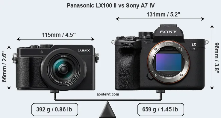 Le Panasonic Lumix DC-LX100 II et le Sony Alpha A7 IV sont deux appareils photo numériques, qui ont été révélés au public, respectivement, en August 2018 et October 2021. Le LX100 II est un appareil photo compact à objectif intégré, tandis que le A7 IV est un appareil photo à objectif interchangeable sans miroir. Les caméras sont équipés d'un capteur quatre tiers (LX100 II) et un capteur plein format (A7 IV). Le Panasonic a une résolution de 16,8 mégapixels, alors que le Sony fournit 32,7 MP.