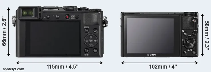 La taille physique et le poids du Panasonic LX100 II et du Sony RX100 V sont illustrés dans le graphique ci-dessous. Les deux caméras sont affichées en fonction de leur taille relative. Toutes les dimensions sont arrondies au millimètre près.