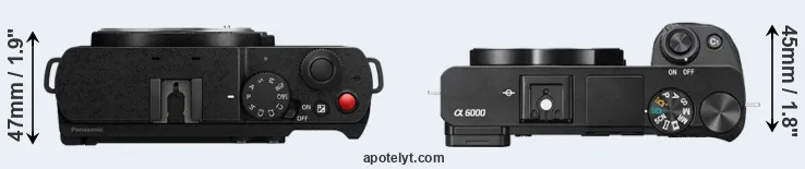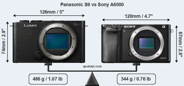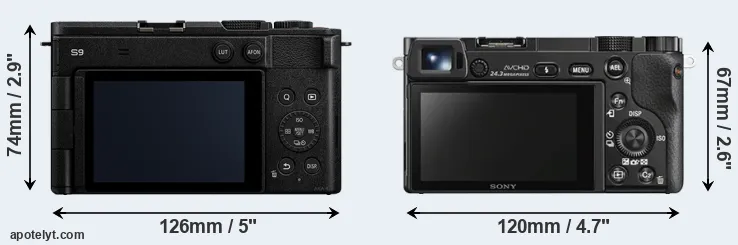 La taille physique et le poids du Panasonic S9 et du Sony A6000 sont illustrés dans le graphique ci-dessous. Les deux caméras sont affichées en fonction de leur taille relative. Toutes les dimensions sont arrondies au millimètre près.