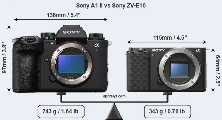 Le Sony A1 II et le Sony ZV-E10 sont deux appareils photo numériques, qui ont été révélés au public, respectivement, en November 2024 et July 2021. Les deux sont des appareil photo à objectif interchangeable sans miroir, qui sont équipés d'un capteur plein format (A1 II) et un capteur APS-C (ZV-E10). Le A1 II a une résolution de 49,8 mégapixels, alors que le ZV-E10 fournit 24,0 MP.