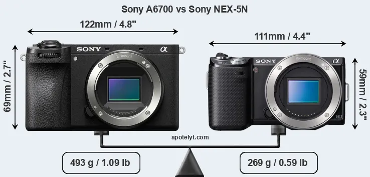 La taille physique et le poids du Sony A6700 et du Sony NEX-5N sont illustrés dans le graphique ci-dessous. Les deux caméras sont affichées en fonction de leur taille relative. Toutes les dimensions sont arrondies au millimètre près.