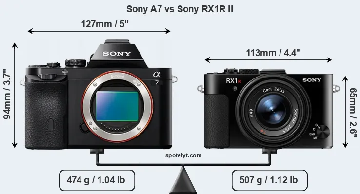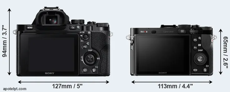 Le Sony Alpha A7 et le Sony Cyber-shot DSC-RX1R II sont deux appareils photo numériques, qui ont été révélés au public, respectivement, en October 2013 et October 2015. Le A7 est un appareil photo à objectif interchangeable sans miroir, tandis que le RX1R II est un appareil photo compact à objectif intégré. Les deux caméras sont équipés d'un capteur plein format. Le A7 a une résolution de 24,0 mégapixels, alors que le RX1R II fournit 42,2 MP.