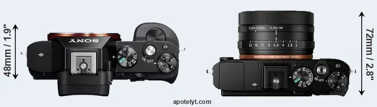 La taille physique et le poids du Sony A7 et du Sony RX1R II sont illustrés dans le graphique ci-dessous. Les deux caméras sont affichées en fonction de leur taille relative. Toutes les dimensions sont arrondies au millimètre près.