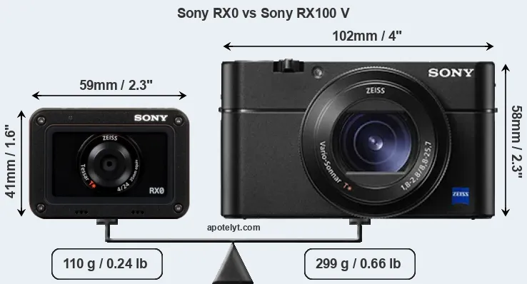 La taille physique et le poids du Sony RX0 et du Sony RX100 V sont illustrés dans le graphique ci-dessous. Les deux caméras sont affichées en fonction de leur taille relative. Toutes les dimensions sont arrondies au millimètre près.