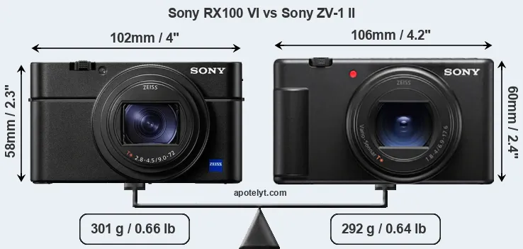 Le Sony Cyber-shot DSC-RX100 VI et le Sony Cyber-shot ZV-1 II sont deux appareils photo numériques, qui ont été révélés au public, respectivement, en June 2018 et May 2023. Le RX100 VI et le ZV-1 II sont des appareils photo compacts à objectif intégré, qui sont équipés d'un capteur de 1 pouce. Les deux caméras offrent une résolution de 20,0 mégapixels.