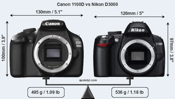 La Canon EOS 1100D e la Nikon D3000 sono due fotocamere digitali rivelate al pubblico rispettivamente a febbraio 2011 e luglio 2009. Entrambe sono fotocamere DSLR (Digital Single Lens Reflex) che sono dotati di un sensore APS-C. La Canon ha una risoluzione di 12,2 megapixel, mentre la Nikon fornisce 10,0 MP.