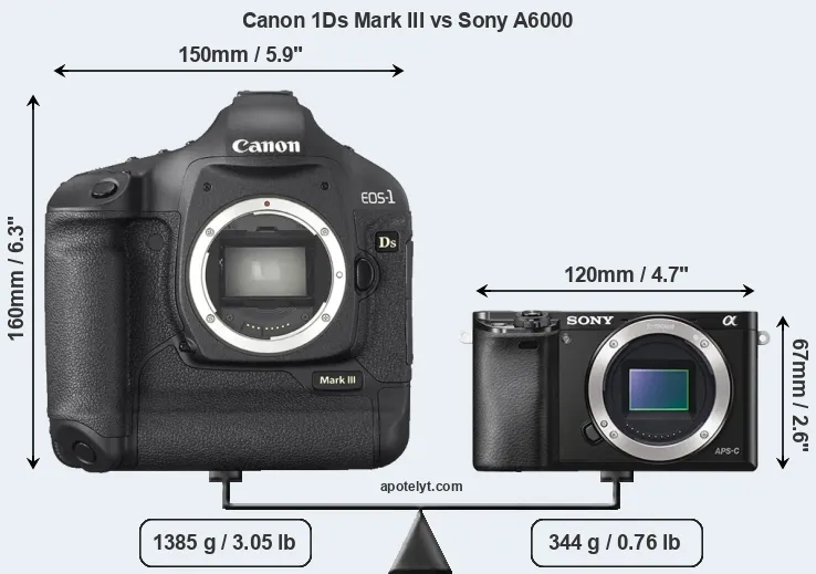 La dimensione fisica e il peso della Canon 1Ds Mark III e Sony A6000 sono illustrate nel grafico sottostante. Le due fotocamere vengono visualizzate in base alle loro dimensioni relative. Tutte le dimensioni sono arrotondate al millimetro più vicino.