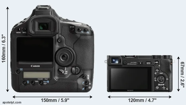 La Canon EOS-1Ds Mark III e la Sony Alpha A6000 sono due fotocamere digitali rivelate al pubblico rispettivamente a agosto 2007 e febbraio 2014. Il 1Ds Mark III è una fotocamera DSLR, mentre A6000 è una fotocamera mirrorless con obiettivo intercambiabile.Le fotocamere sono dotati di un sensore full frame (1Ds Mark III) e un sensore APS-C (A6000). La Canon ha una risoluzione di 21,0 megapixel, mentre la Sony fornisce 24,0 MP.