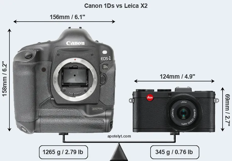 La Canon EOS-1Ds e la Leica X2 sono due fotocamere digitali rivelate al pubblico rispettivamente a settembre 2002 e maggio 2012. Il 1Ds è una fotocamera DSLR, mentre X2 è una fotocamera compatta con obiettivo integrato. Le fotocamere sono dotati di un sensore full frame (1Ds) e un sensore APS-C (X2). La Canon ha una risoluzione di 11,0 megapixel, mentre la Leica fornisce 16,1 MP.