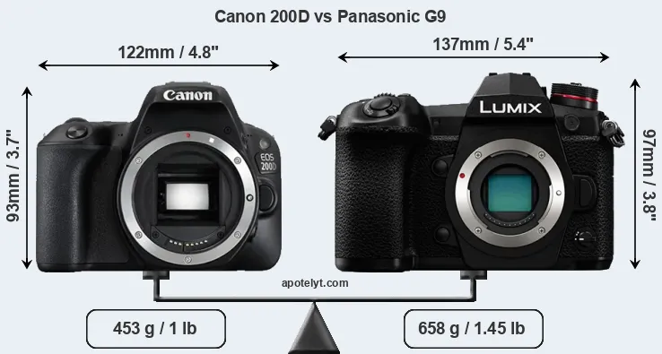 La dimensione fisica e il peso della Canon 200D e Panasonic G9 sono illustrate nel grafico sottostante. Le due fotocamere vengono visualizzate in base alle loro dimensioni relative. Tutte le dimensioni sono arrotondate al millimetro più vicino.