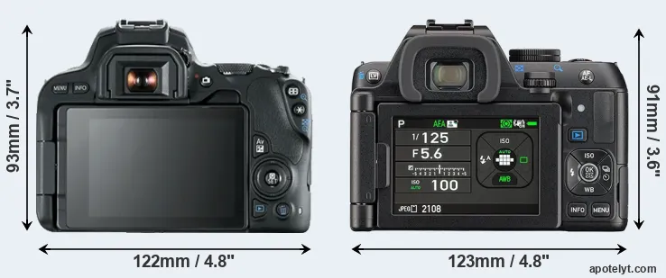 La Canon EOS 200D e la Pentax K-S2 sono due fotocamere digitali rivelate al pubblico rispettivamente a giugno 2017 e febbraio 2015. Entrambe sono fotocamere DSLR (Digital Single Lens Reflex) che sono dotati di un sensore APS-C. La Canon ha una risoluzione di 24,0 megapixel, mentre la Pentax fornisce 20,0 MP.