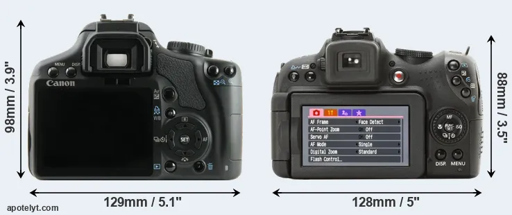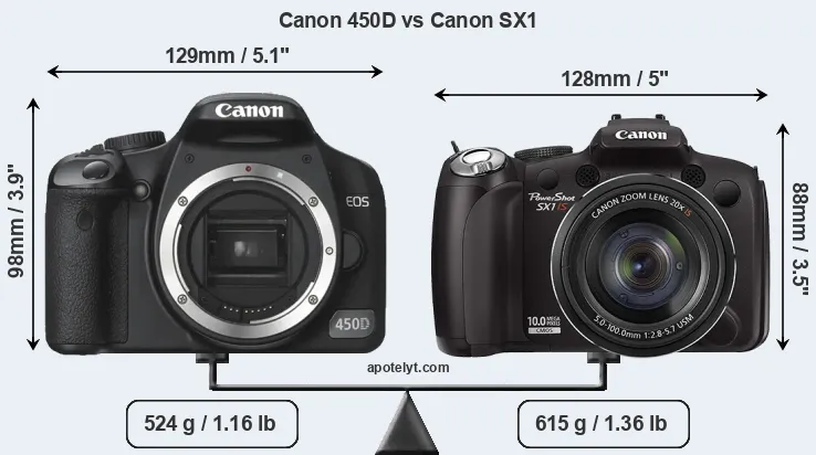 La Canon EOS 450D e la Canon PowerShot SX1 IS sono due fotocamere digitali rivelate al pubblico rispettivamente a gennaio 2008 e settembre 2008. Il 450D è una fotocamera DSLR, mentre SX1 è una fotocamera compatta con obiettivo integrato. Le fotocamere sono dotati di un sensore APS-C (450D) e un sensore da 1/2,3 pollice (SX1). La 450D ha una risoluzione di 12,2 megapixel, mentre la SX1 fornisce 10,0 MP.